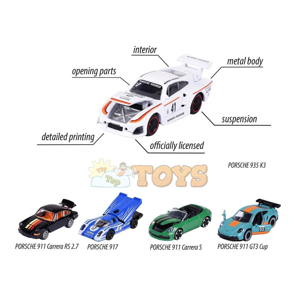 • Porsche 935 K3: This metal car is an exact copy of the famous Porsche 935 K3, a racing car that dominated endurance competitions in the 1970s and 1980s. The car has a matte white color, which gives it a sporty and aggressive look. The car has a scale of 1:64, which means that it is about 7 cm long. The car also has doors that can be opened, showing a well-crafted interior.