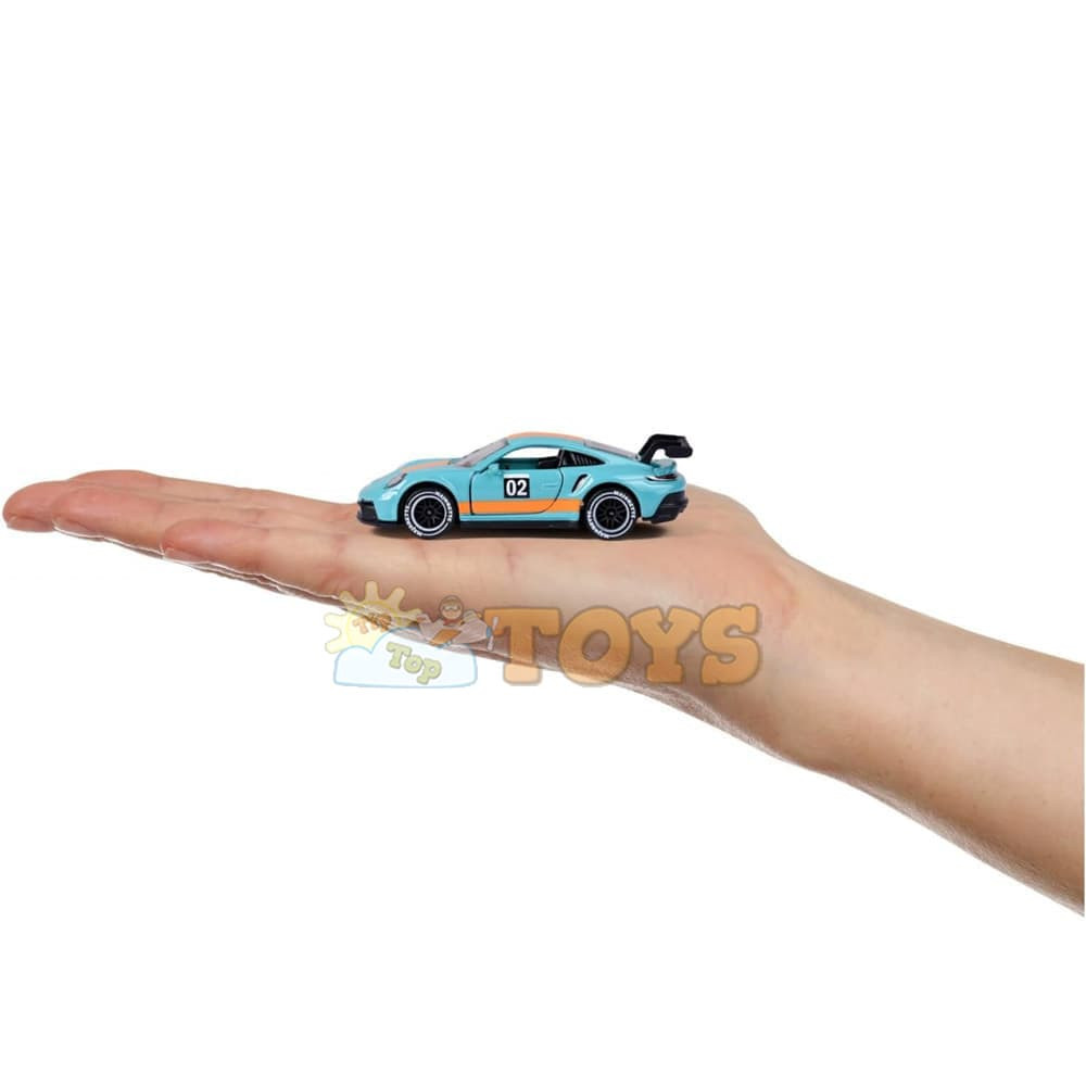 • Porsche 911 GT3 Cup (992): This metal car is an exact replica of the famous Porsche 911 GT3 Cup (992), a high-end racing car. The car has a light blue color, which highlights its sporty and aerodynamic lines. The car has a scale of 1:64, which means that it is about 7 cm long. The car also has doors that can be opened, showing a well-crafted interior.