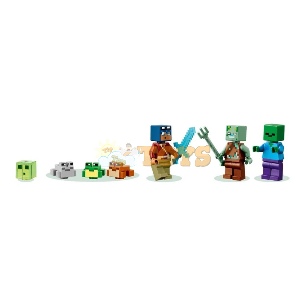 Minecraft® Figure Set - This authentic set includes a house built with Minecraft characters: The swamp explorer, a zombie, a drowned, a slime and 3 frogs.