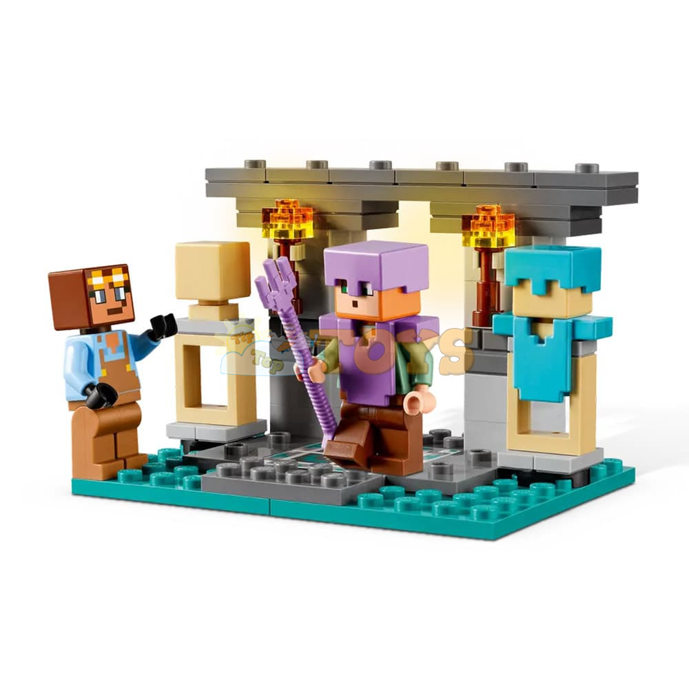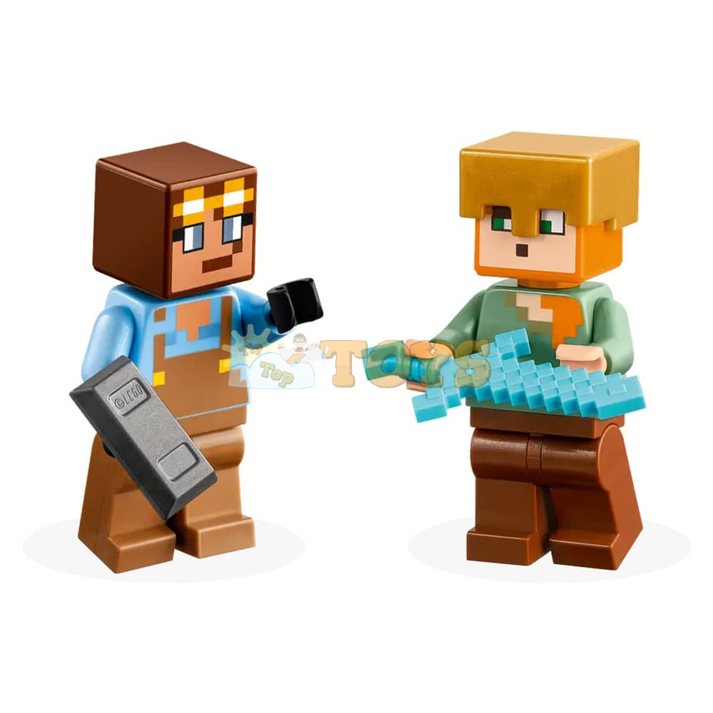 Action Hero Toys - Includes Minecraft® Alex and the Harnicer minifigures, 3 buildable environments and Minecraft armor and weapons, including a golden axe, 2 swords, 2 shields and an enchanted trident.