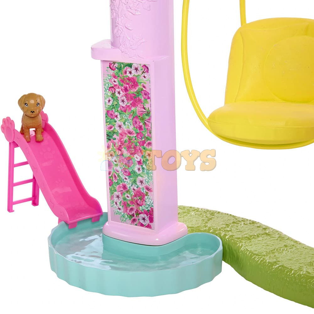 Welcome to the Barbie® Dreamhouse™, where 360-degree play inspires endless fun! This updated version of the iconic dollhouse includes an open design, premium features and over 75 story pieces. Barbie® can throw the pool party of her dreams with her home's spectacular three-story spiral slide. Watch as Barbie® doll and her friends slide down the slide into the pool! Dolls are not included. This dollhouse also doubles as a real pet palace, even including a puppy figure! Fluffy friends will have a blast with the pet elevator, pet slide, pool, puppy bed, doggy door and pet house. Right from the start, kids can spend hours exploring the ten different play areas: a kitchen, living room, dining room, bedroom, bathroom, closet, bonus room, balcony, swimming pool and the biggest slide yet. The pool party can turn into a slumber party with room to accommodate four dolls! The living room console transforms into a perfect sleepover spot with a starry backdrop and an extra bed for two dolls. Dreamy features include integrated lights and sounds in the kitchen and bathroom, fun furnishings -- including an extra pull-out bed in the bedroom -- and a top-floor balcony with a palm tree. Exciting play details with over 75 pieces, a functional wheelchair-accessible lift, an adorable swing, a fabulous wardrobe and more. When kids 3 years and older "step into" the Barbie® Dreamhouse™ playset, they'll never run out of stories to tell!