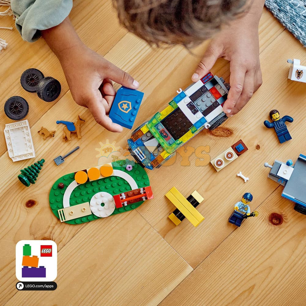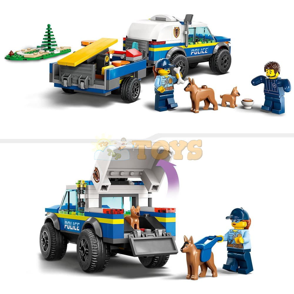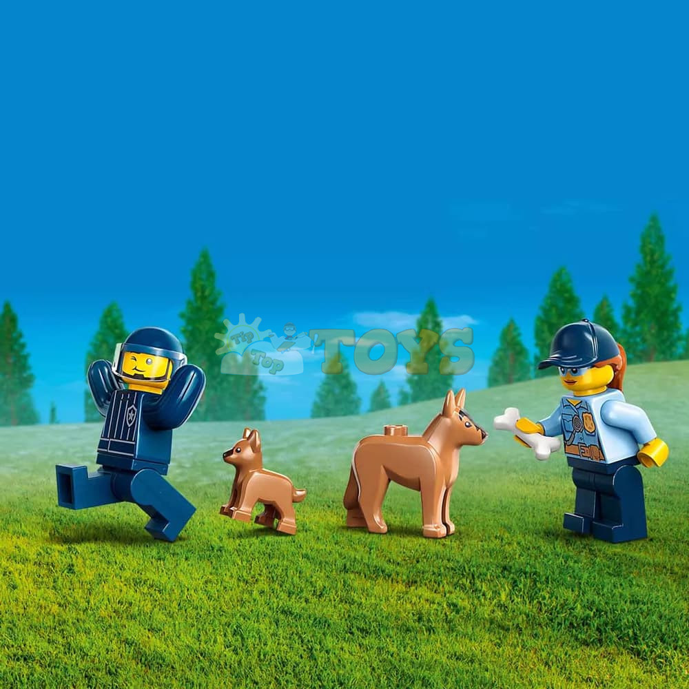 What's in the box? - Everything kids need to build a K9 police SUV, a trailer, 3 dog trainers and a training area, plus 2 minifigures, a dog figure and a puppy figure.