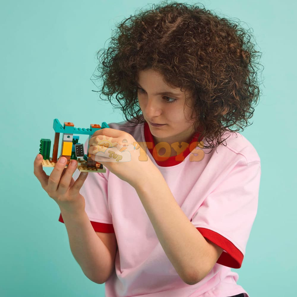 The action takes place in a desert outpost where kids play as a Cactus Knight, complete with diamond armor and shield and a sword. When 3 illagers arrive to steal the treasure, players must defend the outpost. The set includes rockets that can be launched with a simple movement of the finger, a variety of weapons and a barrel containing the treasure. For added fun, the LEGO Builder app lets kids zoom and rotate models in 3D on their device.
