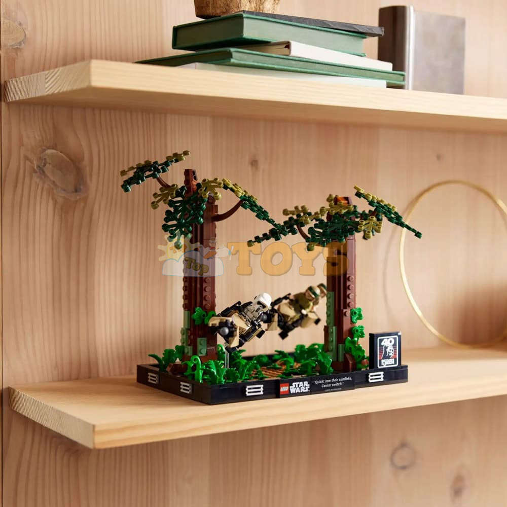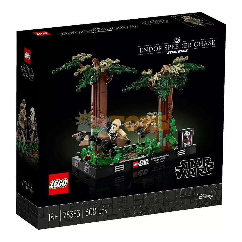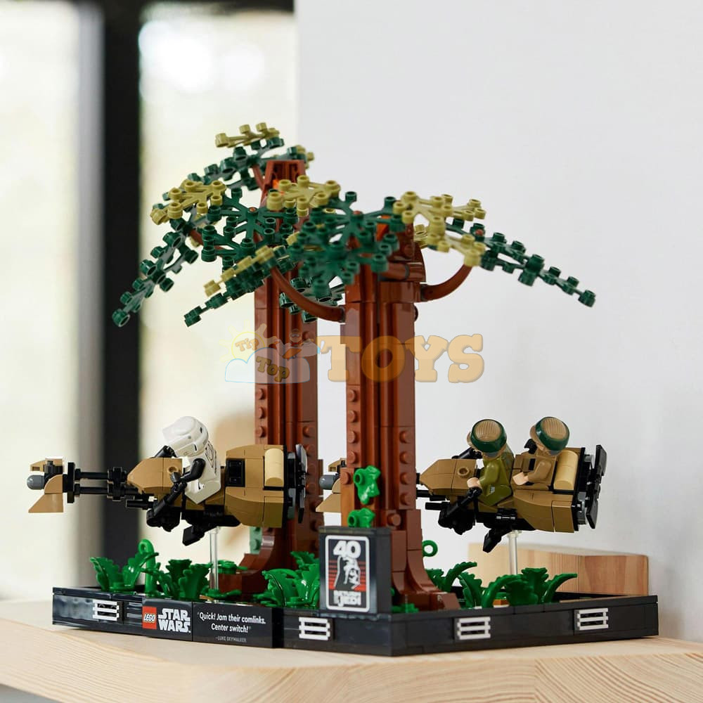 Capture the dynamism of a thrilling Star Wars: Return of the Jedi scene with the LEGO® Star Wars™ Endor Speeder Chase Diorama (75353). It features 3 LEGO minifigures (Princess Leia, Luke Skywalker and a Scout Trooper), 2 speeder bikes with transparent elements so you can pose them at angles as if flying through the forests of Endor, 2 buildable trees and new-for-May-2023 fern elements. Complete this build-and-display model with a plaque featuring Luke Skywalker’s words (“Quick! Jam their comlinks. Center switch!”) and a plaque with the Star Wars: Return of the Jedi 40th anniversary logo.