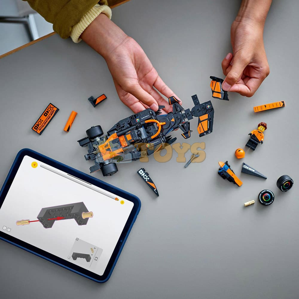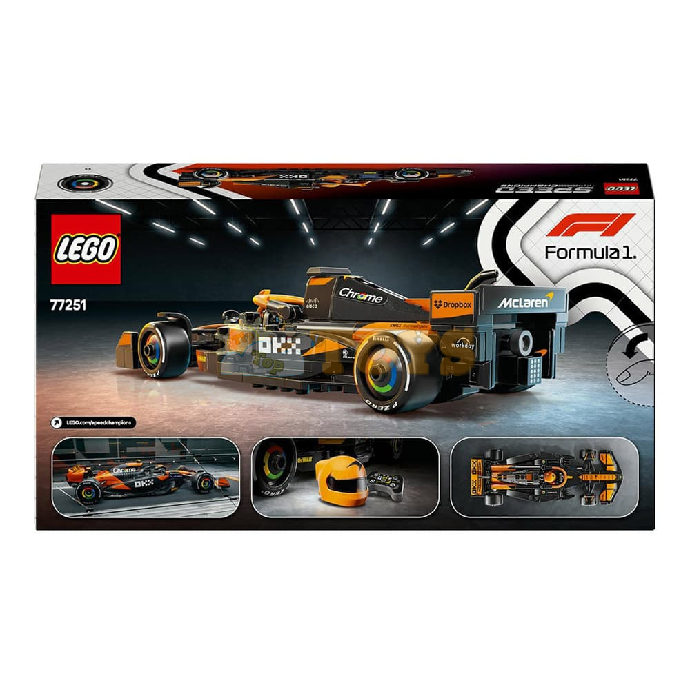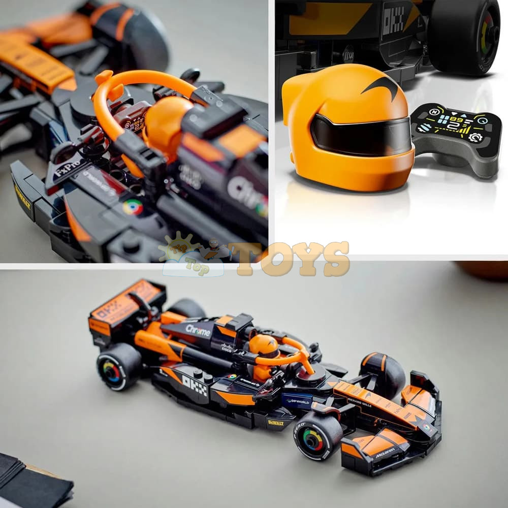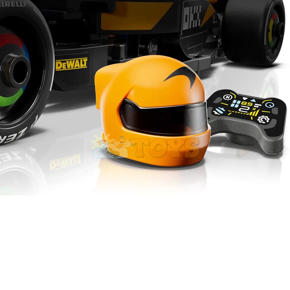 The F1 model car features a cockpit that opens by lifting the halo bar, a rear wing, wishbone suspension, sponsor stickers and wider rear tires imprinted with “Pirelli.” The toy vehicle also comes with a driver minifigure wearing a McLaren outfit and a winged helmet to place inside the cockpit for racing action.