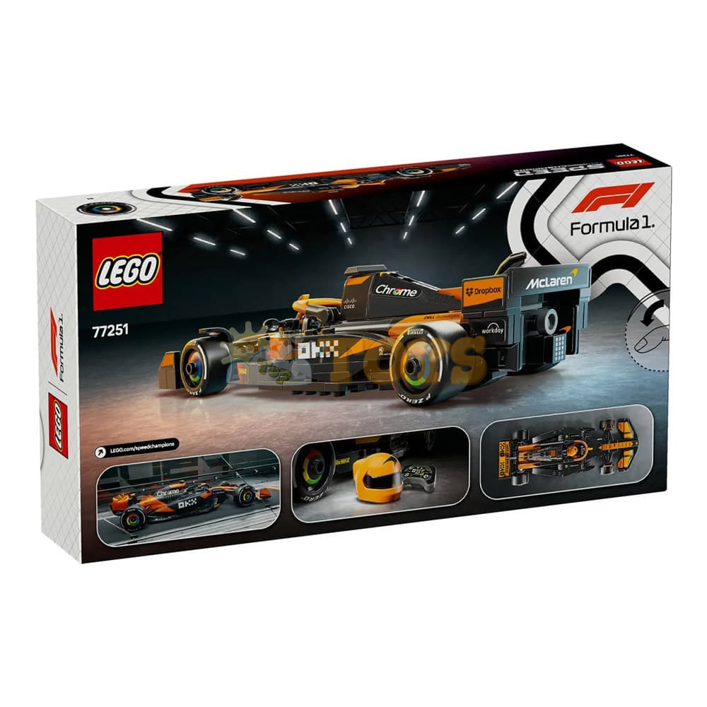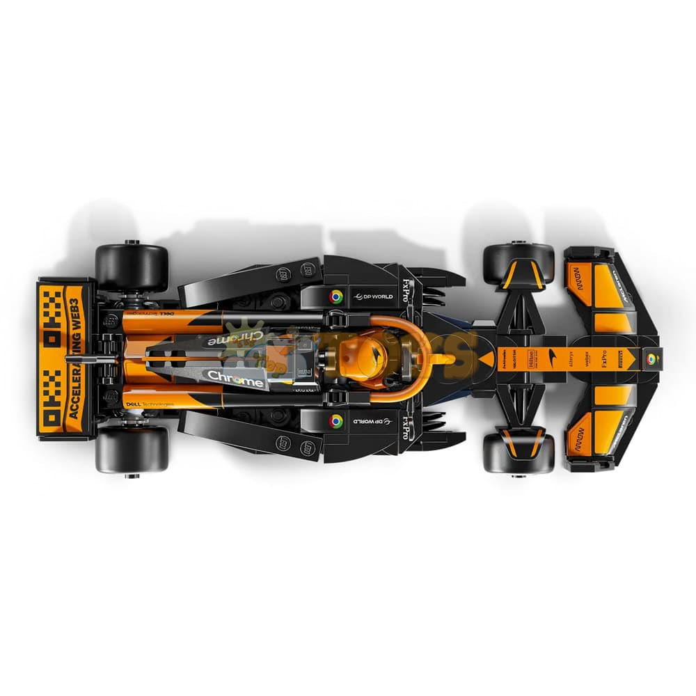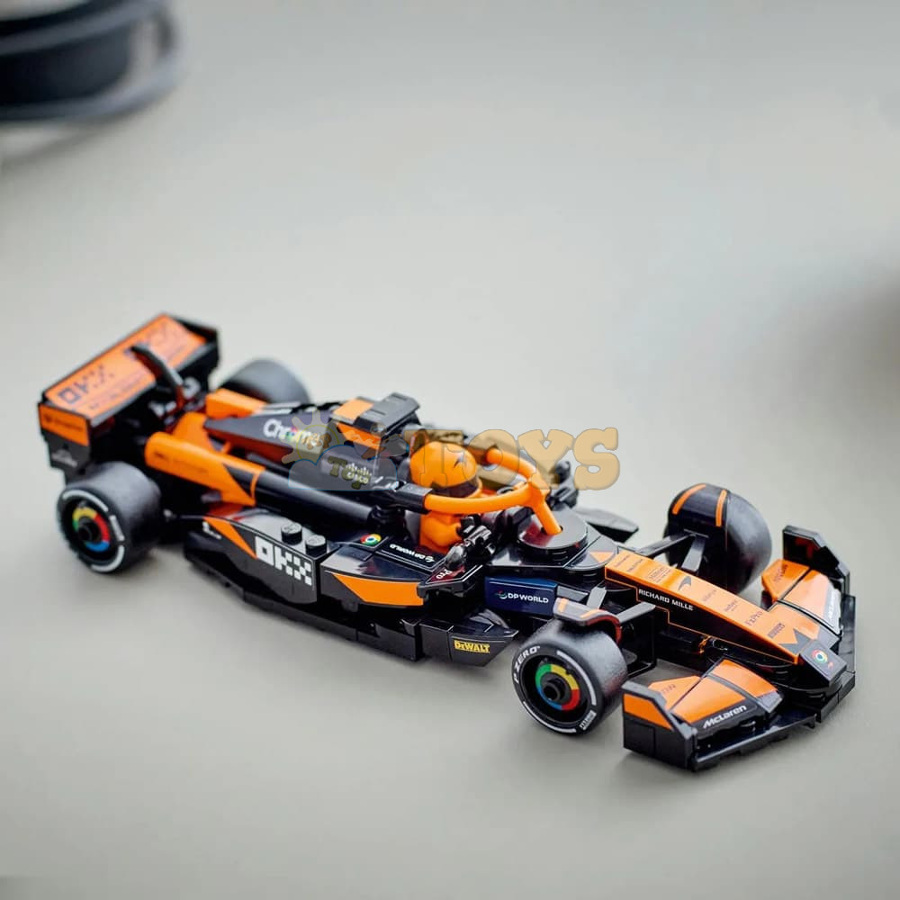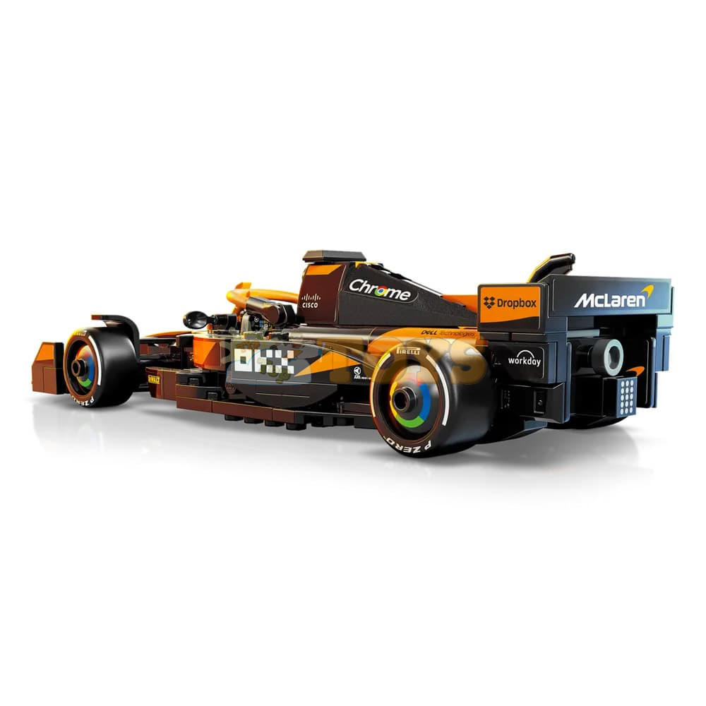 The F1 model car features a cockpit that opens by lifting the halo bar, a rear wing, wishbone suspension, sponsor stickers and wider rear tires imprinted with “Pirelli.” The toy vehicle also comes with a driver minifigure wearing a McLaren outfit and a winged helmet to place inside the cockpit for racing action.