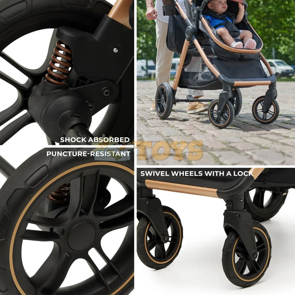 The ESME 3-in-1 SAND BEIGE is particularly easy to maneuver, so it will work well even in crowded areas. Its construction combined with swivel wheels makes it easier to drive. The front wheels can be locked for straight-ahead travel on more difficult terrain. In addition, the stroller is very easy to fold to a compact size, and that's together with the seat! A trip to the mountains? Or maybe to the seaside? The ESME 3-in-1 SAND BEIGE can handle any challenge!