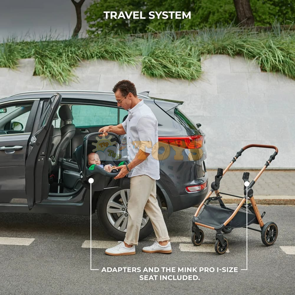 The set includes the MINK PRO i-Size (40-75 cm) infant car seat along with adapters, which allow you to create a travel system. In addition, with the stroller you will receive a cup holder, a universal footmuff, a rain cover, and a bag that can be attached to the handle.