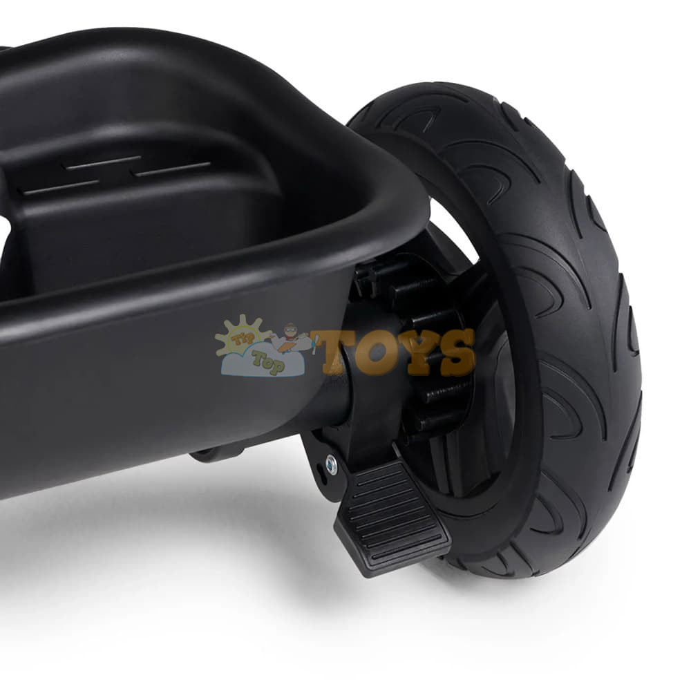 The rear wheels are equipped with brakes that are easily accessible to the parent.