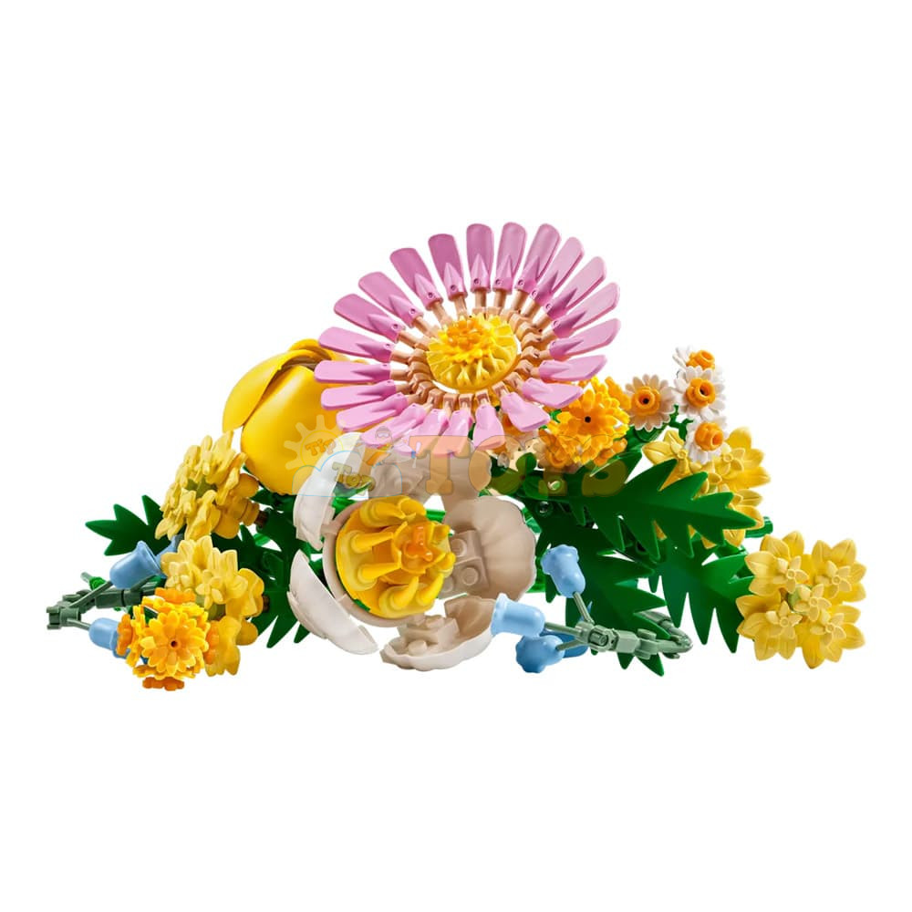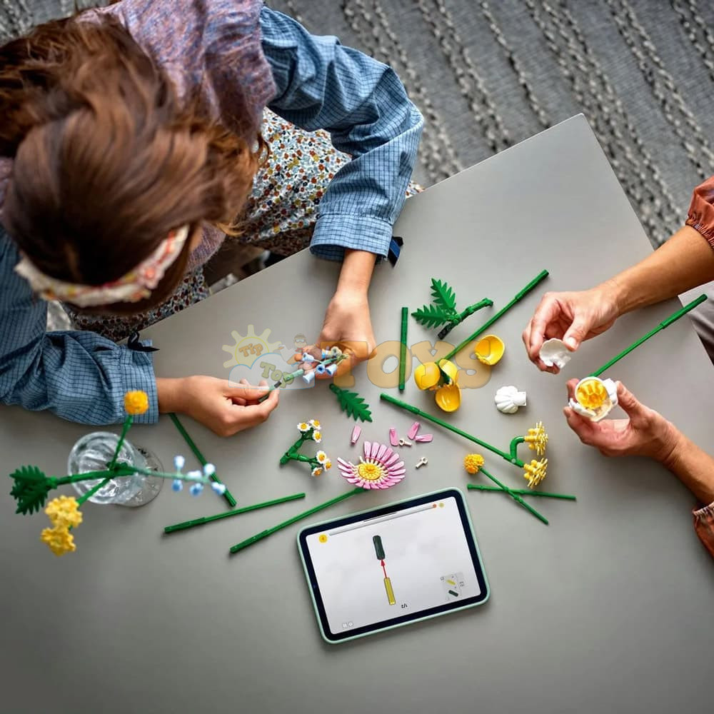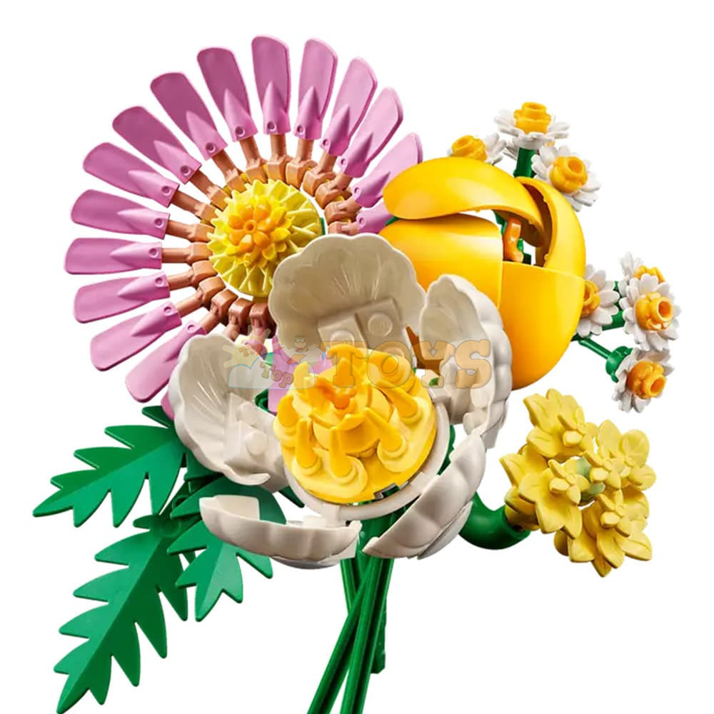 LEGO® flowers – The bouquet blooms with 6 species of spring flowers in pastel shades, including Billy buttons, bluebells, Cleopatra ferns, yellow yarrows, a gerbera, a peony and a tulip.