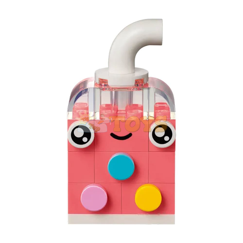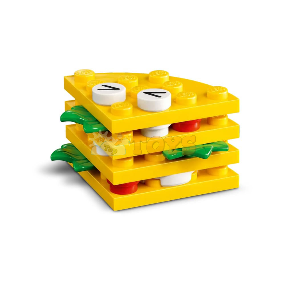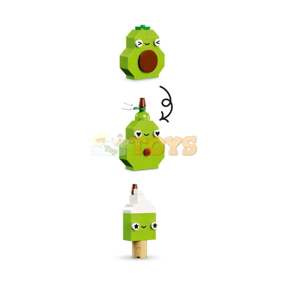 Endless creativity – Kids build a cupcake, ice cream, avocado and taco toy, rebuild into a cake with sprinkles, bubble-tea drink, pear and a panini, then launch into unlimited free-building fun.