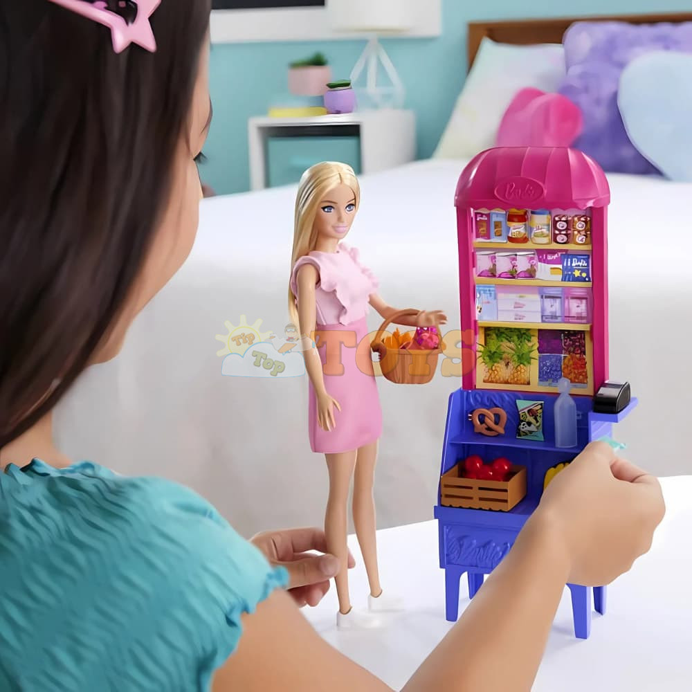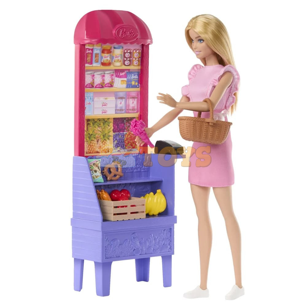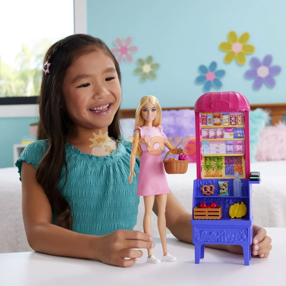 Kids take charge of the shopping list when they join Barbie 'Malibu' for a trip to the market with this playset that includes a fashion doll, market stand and 11 themed accessories!