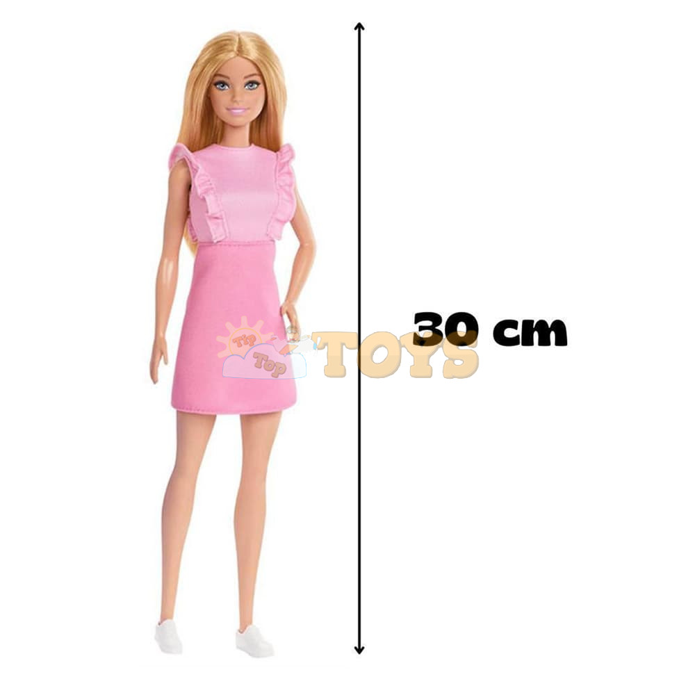 Barbie 'Malibu' doll is dressed for her market trip in a pink dress with ruffles and white sneakers!