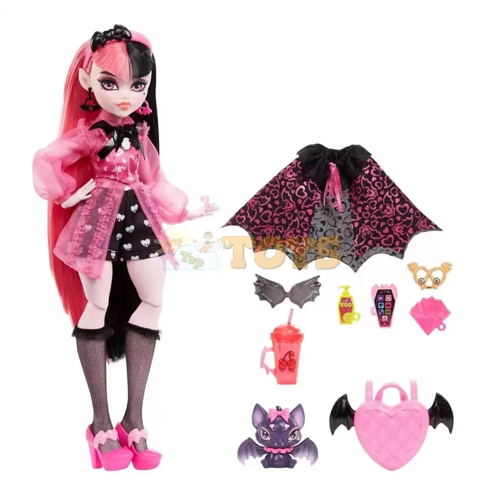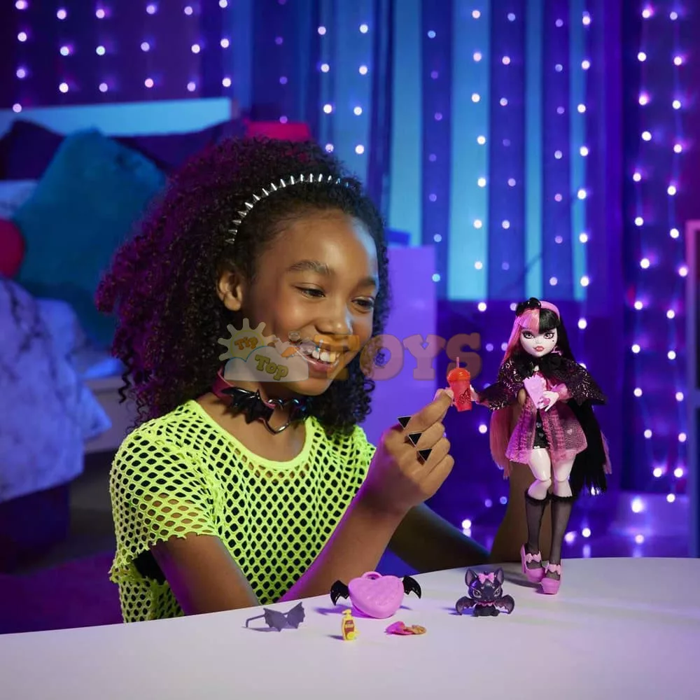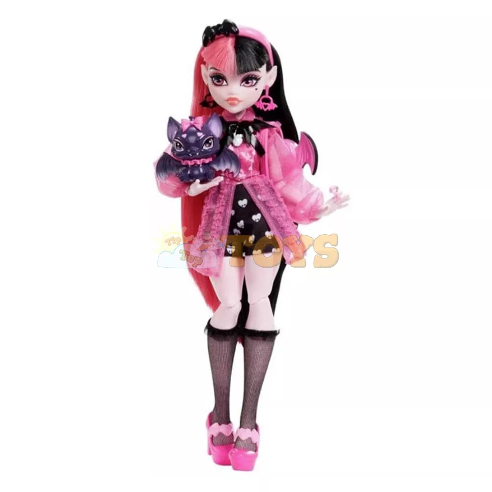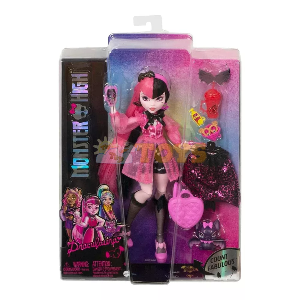 Monster High Draculaura doll looks vamptastic in a wicked-cute outfit! She comes with her pet Count Fabulous, as well as defrightful accessories.