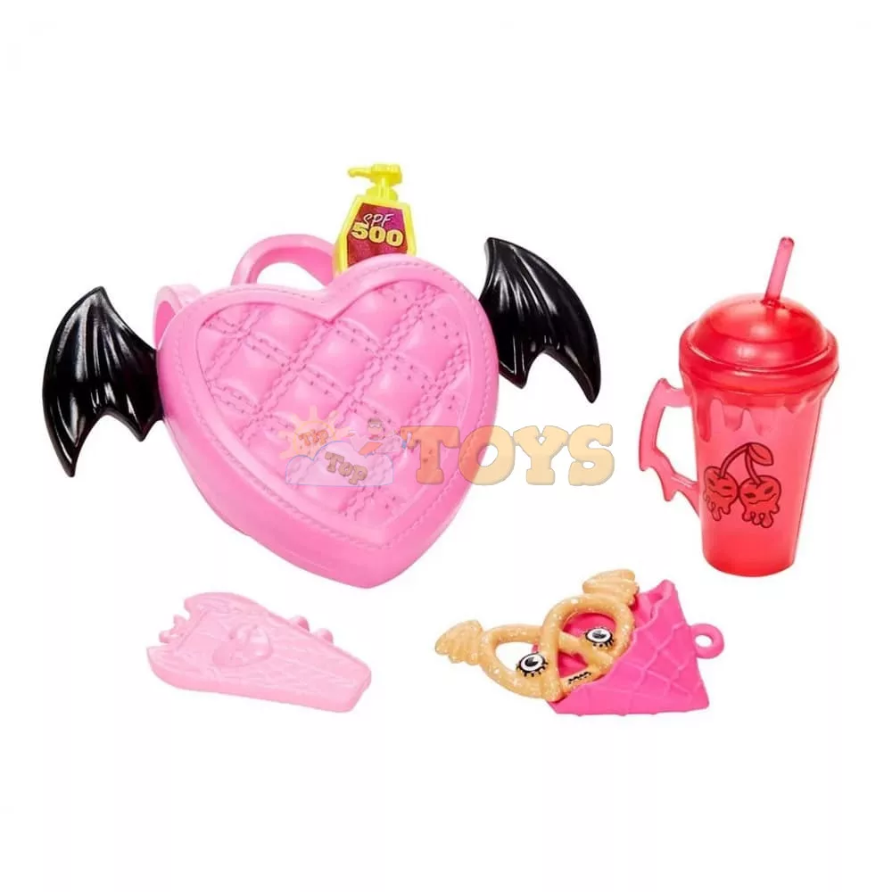 Accessories add to storytelling possibilities: a magic spell book, bat-pack, bento bite lunch box, drink, bottle of SPF 500, sunglasses, and blood-red lip gloss.