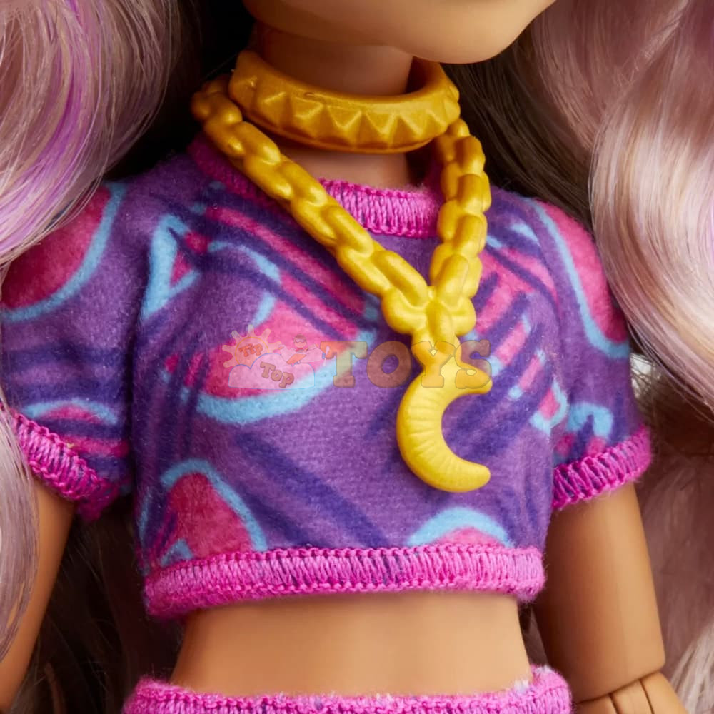This Monster High student boasts a stunning outfit with a unique bag and stylish accessories.