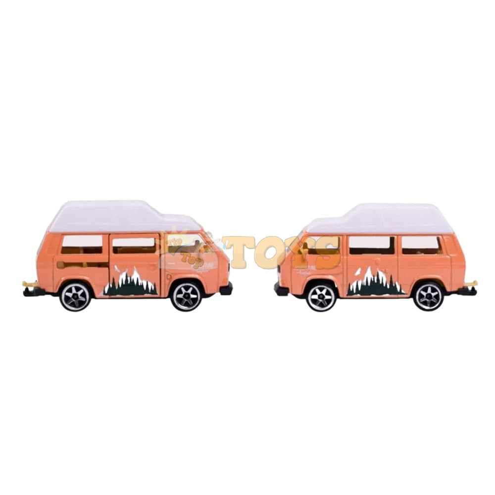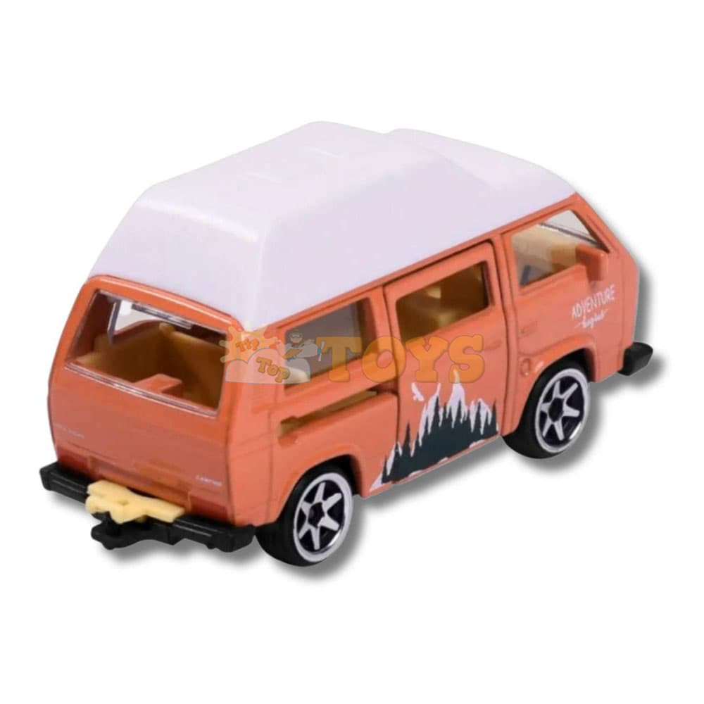 Authentic adventure design: "Adventure" variant in vibrant orange, with off-road graphic accents, functional headlights, metal rims and free-spinning wheels - capturing the essence of the T3 van used on expeditions and holidays.