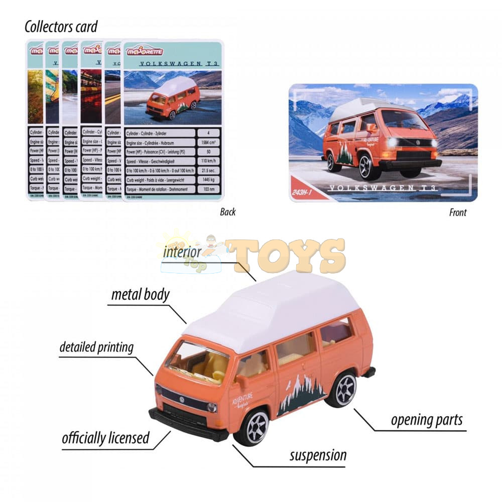 Collector's card included: Each model comes with a detailed collector's card, plus stylish blister packaging for storage or gifting. Note: From the series of 6 officially licensed Volkswagen vehicles, one of the available models (including the T3 Transporter) is delivered at random.