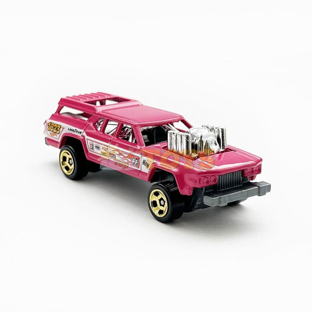 Authentic Cruise Bruiser Design: Painted in hot pink (or limited yellow variants), with detailed racing pads (1623, Goodyear, Mooneyes, MSD, Edelbrock, Hurst), prominent gigantic blown engine, working headlights, RSW (Real Super Wheels) rims with soft rubber tires and free-spinning wheels – capturing the essence of a raked-up muscle wagon, ready for epic crashes.