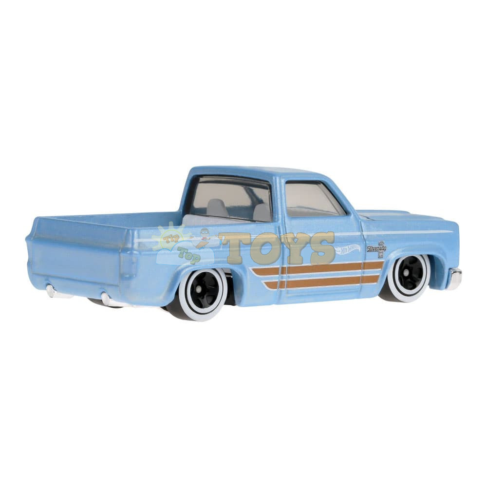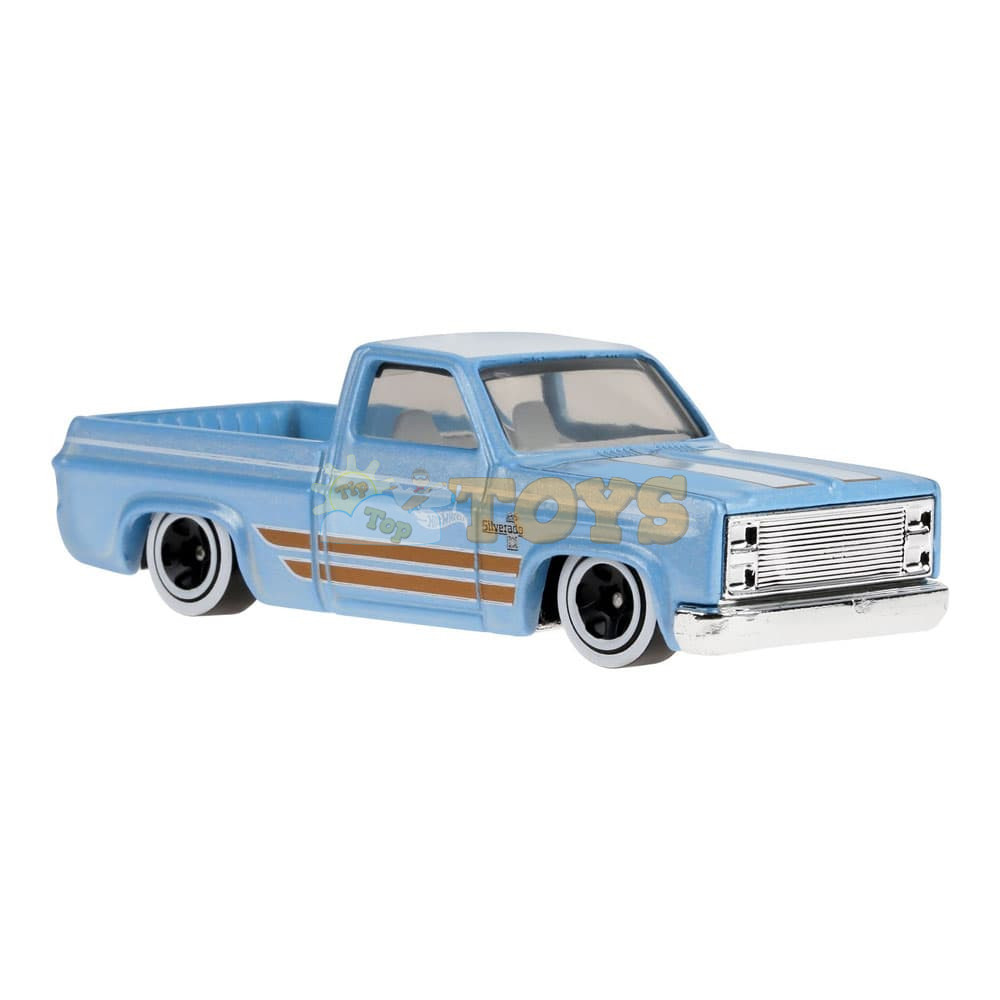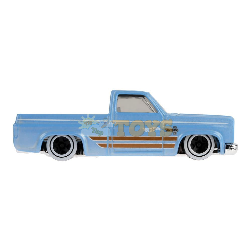 Authentic '83 Silverado Design: Painted in metallic silver with HW Hot Trucks graphics (red and black accents), modified grille, lowered (slammed) ride height, exposed rear drivetrain, working headlights, PR5 wheels with soft rubber tires and free-spinning wheels – capturing the essence of the C/K Rounded Line generation, with premium Silverado trim.