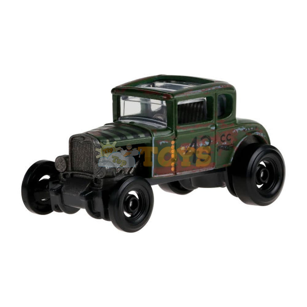 1:64 scale diecast car: Body made of die-cast metal for superior strength, with a detailed plastic chassis and interior, inspired by "Old Red" - a real-life Model A by Hot Wheels designer Craig Callum, used occasionally in racing.