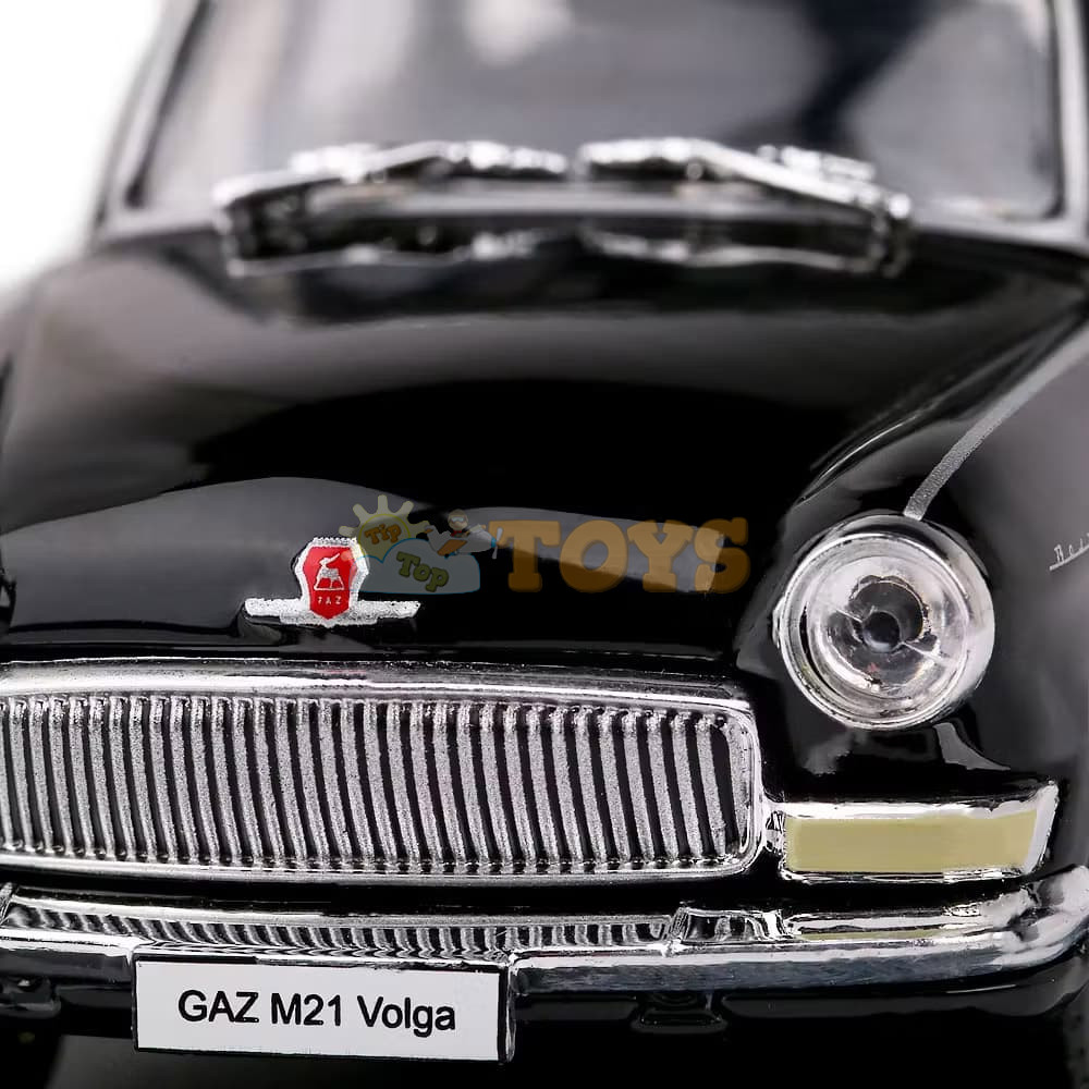 The GAZ M21 Volga is reproduced in the classic and elegant deep black (factory code “čërnyj”), the color preferred by Soviet officials and taxi drivers. The rich color scheme is faithfully reproduced: the massive front grille with the central “whale”, the thick bumpers with cornering, the arrow-shaped side moldings, the chrome handles and the famous red star on the hood. The round headlights, the “rocket” taillights and the chrome-plated rims with the jumping deer emblem are executed with remarkable precision – it looks exactly like a Volga fresh from the Gorky plant.
