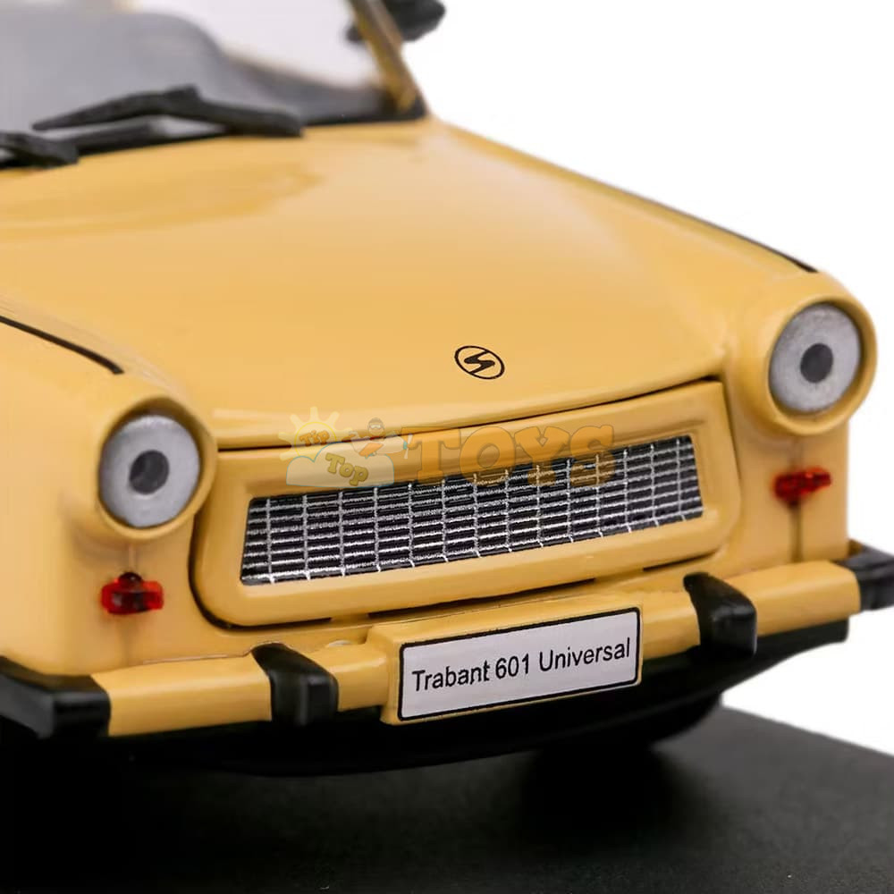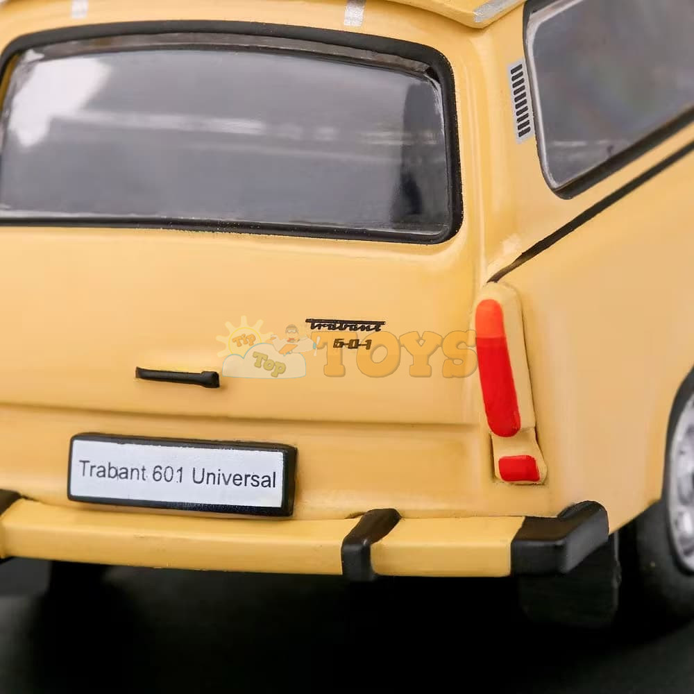 The Trabant 601 Universal is reproduced in papaya yellow (“papageigelb” – factory code 23), one of the most cheerful and typical shades of the 70s-80s in the GDR. The Duroplast (reinforced plastic) body is reproduced with a specific slightly matte texture, the large side windows and the rear hatch with panoramic rear window are perfect. Details include the front grille with stylized "S" logo, small round headlights, rectangular red-and-white taillights, slim chrome bumpers, round exterior mirrors and characteristic dual wipers. The silver rims with center cap and realistic profile tires, along with the printed East German license plate, give it a 100% authentic look - it looks just like a Trabi Combi ready to go on vacation with a tent on the roof!