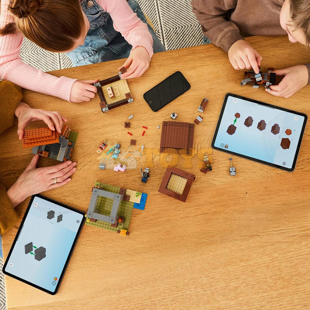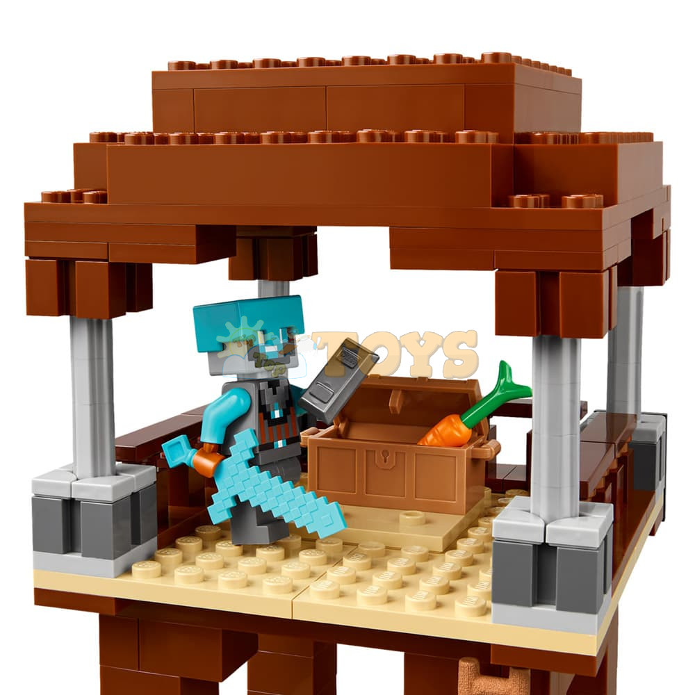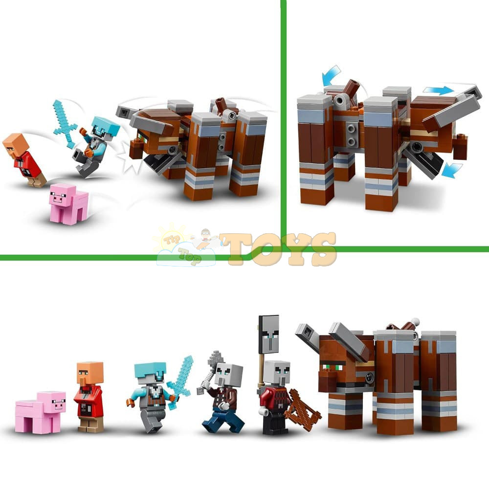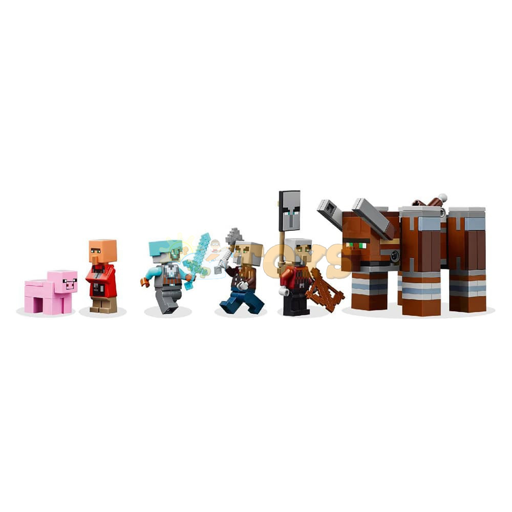 The set includes 4 LEGO Minecraft minifigures: a Space Sentinel, Raid Captain, mason villager and a Vindicator. A buildable ravager figure has a lever-operated function that lets kids make jaw-snapping and head-butting movements. A watchtower includes ladders to provide access between the three floors, banners showing pillager faces and a chest of precious loot. The mason’s house has an opening door and a furnished interior with a bed and a stonecutter. There’s also a LEGO Minecraft pig figure and accessories including a training dummy, torch, carrot, iron ingot, diamond helmet, diamond sword, crossbow and an iron axe. The LEGO Builder app gives kids the added fun of using their device to zoom in and rotate models in 3D. Contains 665 pieces.
