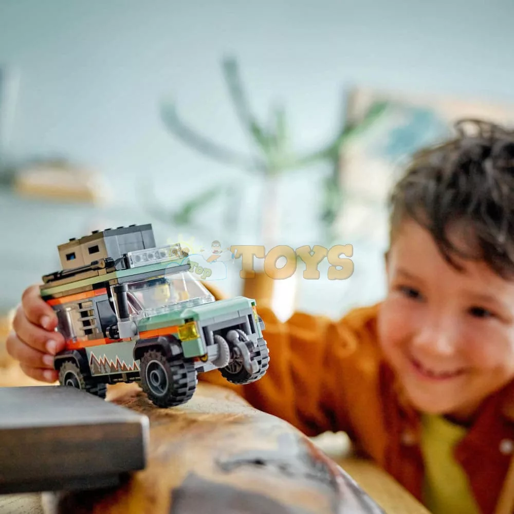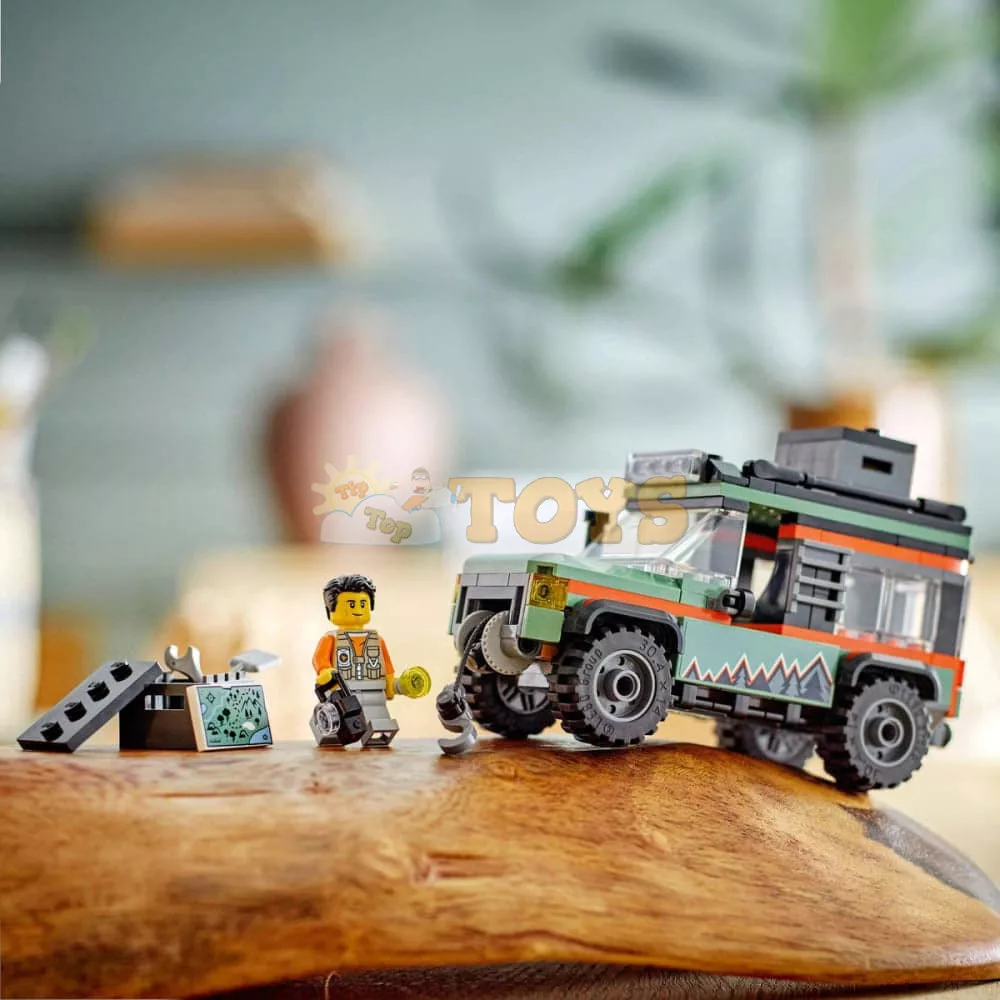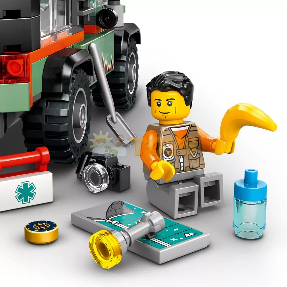 Vehicle set packed with LEGO® minifigure accessories – Includes a toy camera, water bottle, flashlight, map, compass, binoculars, tools and a first aid kit for pretend play